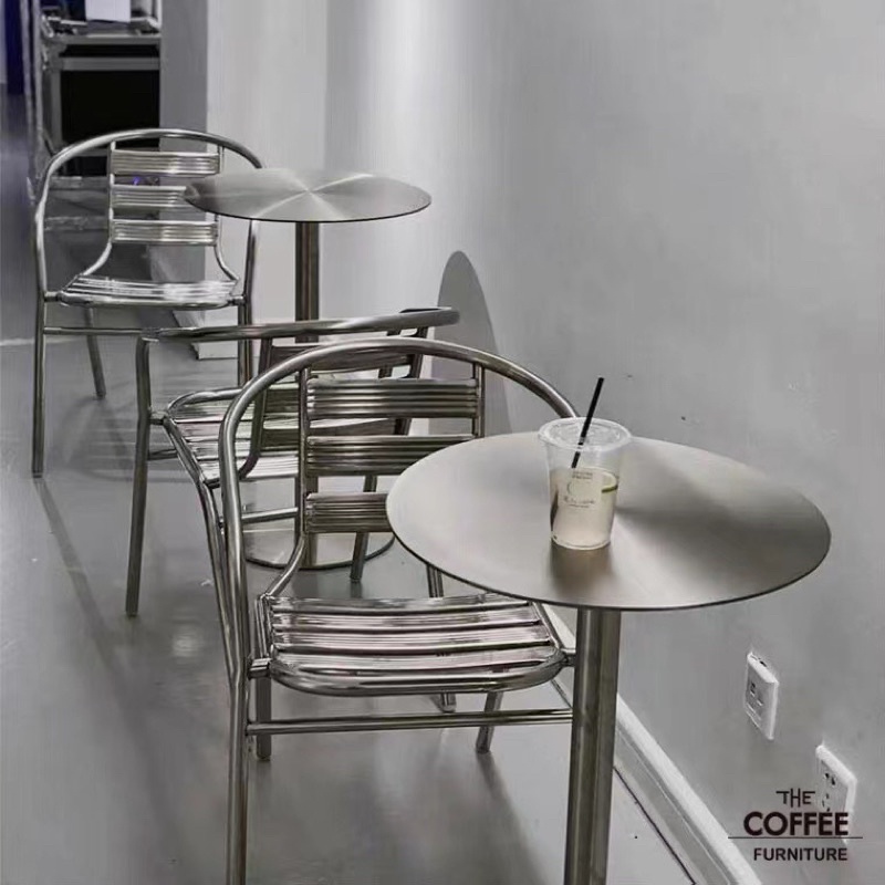 Mẫu bàn ghế Inox cao cấp mang phong cách hiện đại luôn được các quán coffee ưu ái lựa chọn đây ạ. Mẫu bàn ghế với chất liệu inox siêu bền và chắc chắn, phù hợp khi để không gian ngoài trời