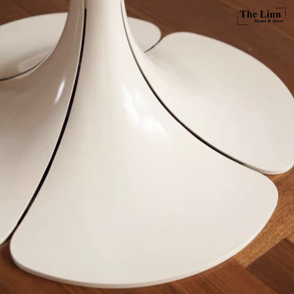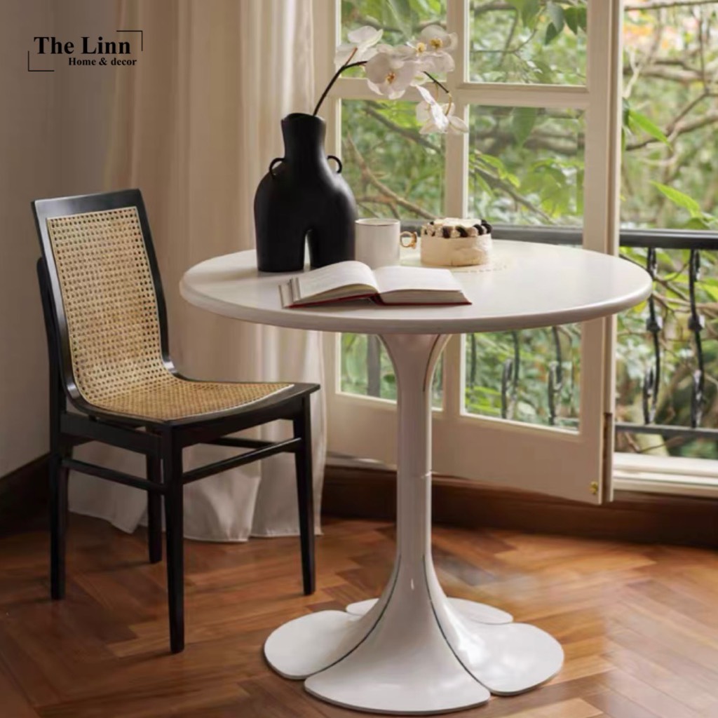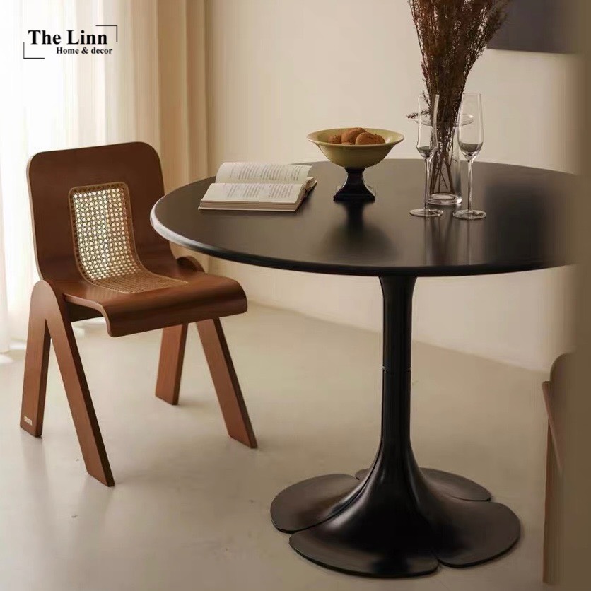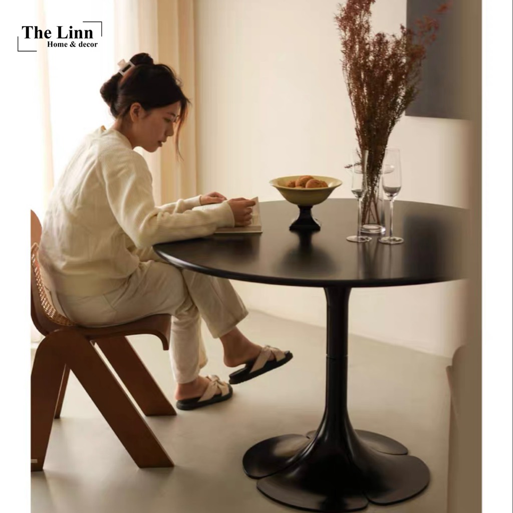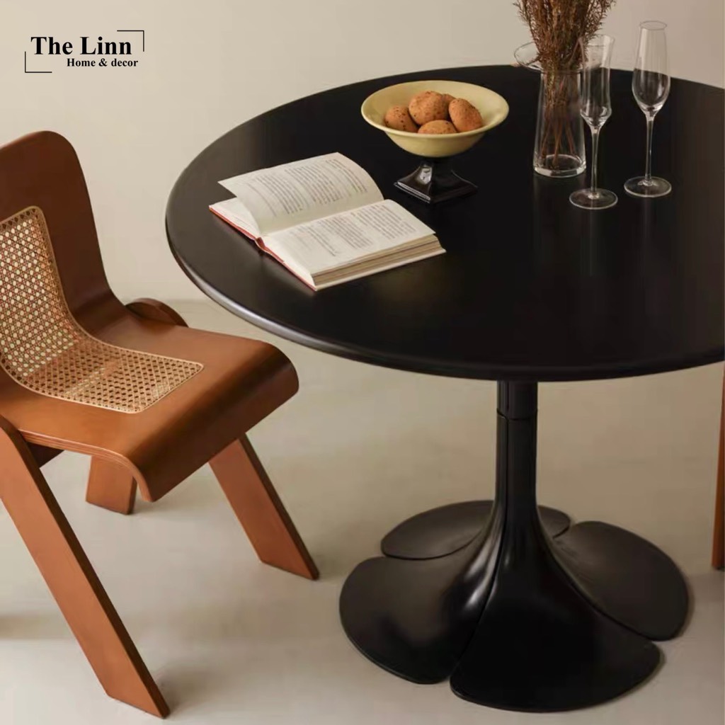 𝑷𝒆𝒕𝒂𝒊𝒍𝒔 𝑻𝒂𝒃𝒍𝒆 với thiết kế bàn gỗ tròn basic, chân tạo hình cánh hoa độc đáo với màu đen/trắng nổi bật.